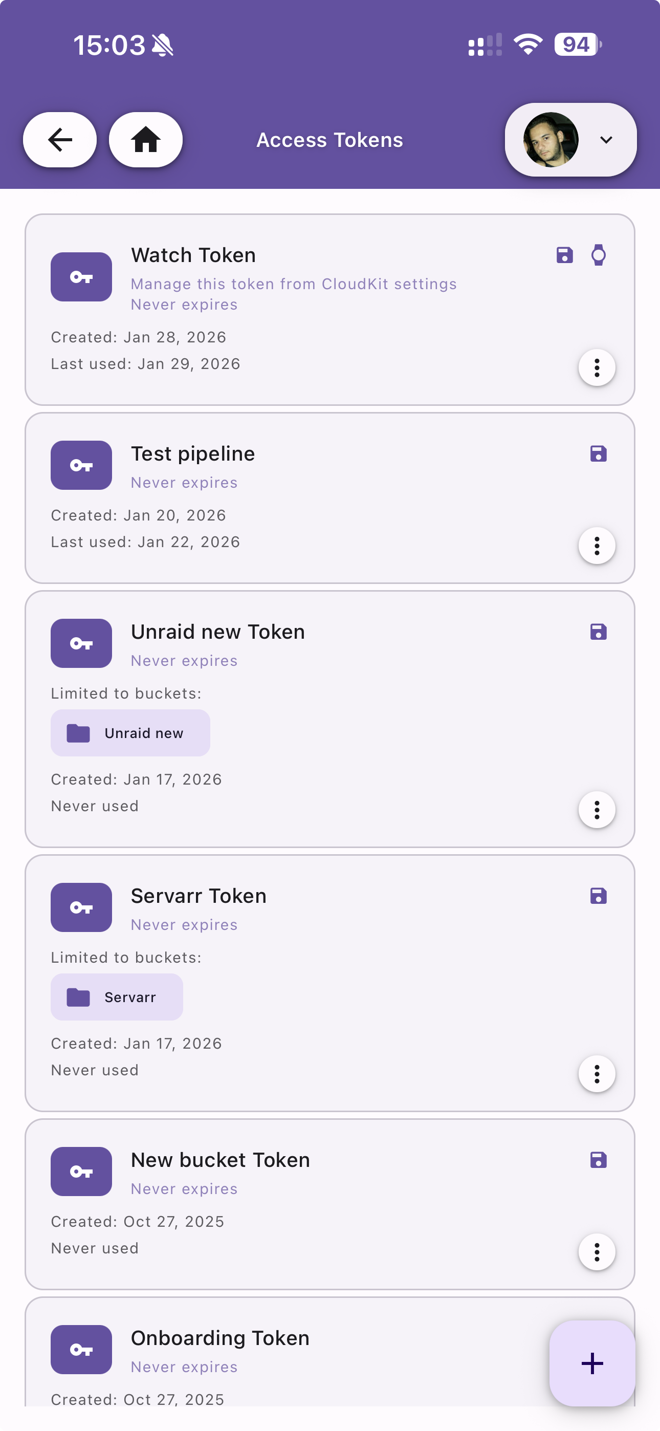 Tap the menu icon on each token to copy, edit, or revoke it. Use the + button to create a new token.