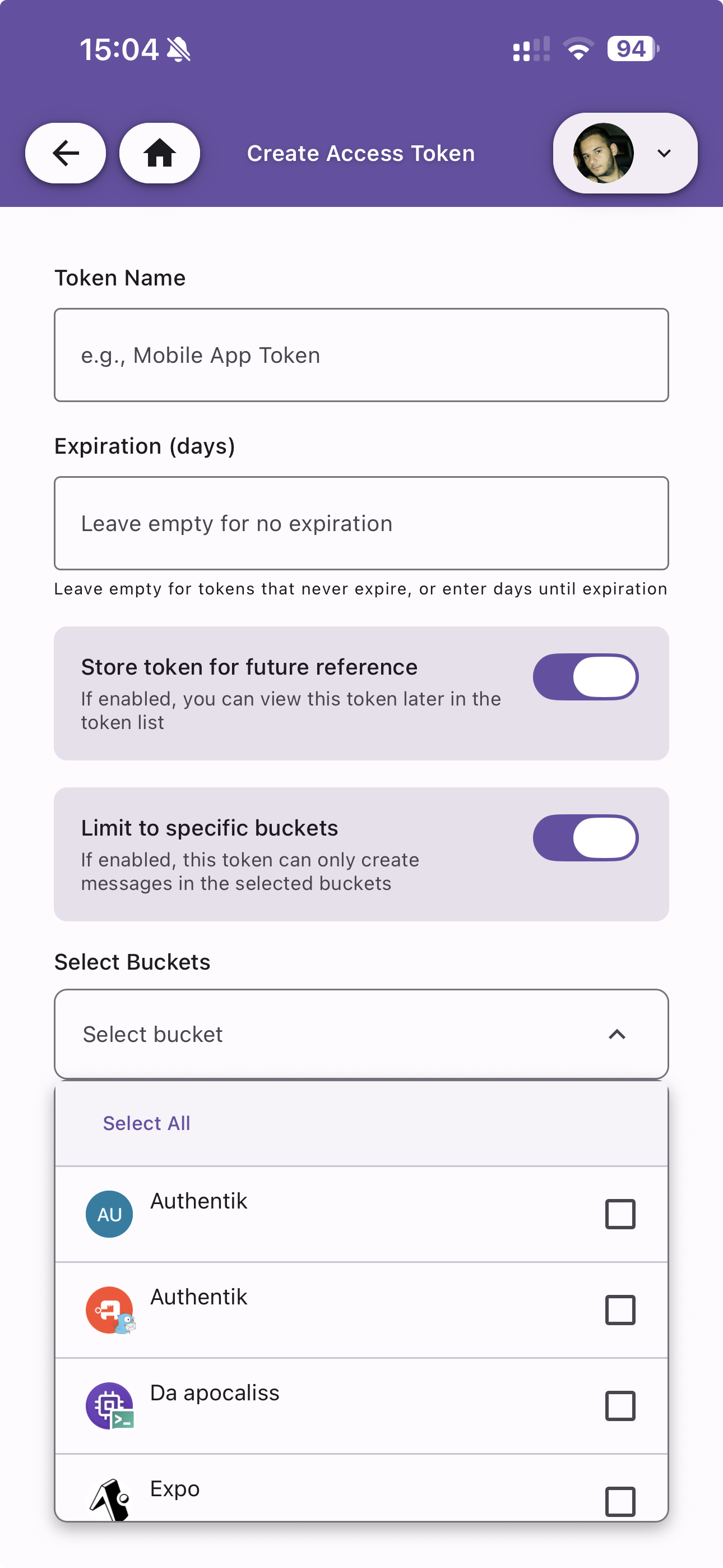 | Limit to specific buckets | When enabled, the token can only send messages to the selected buckets. When disabled, it has access to all buckets |
