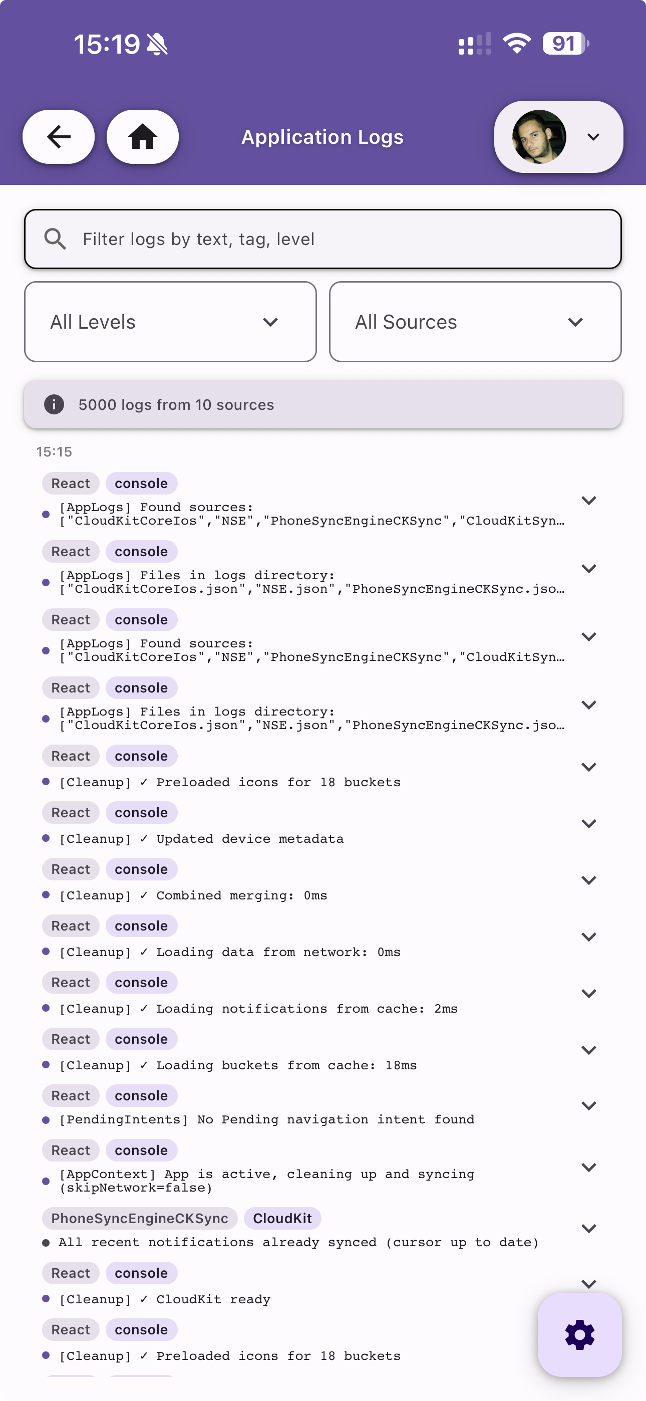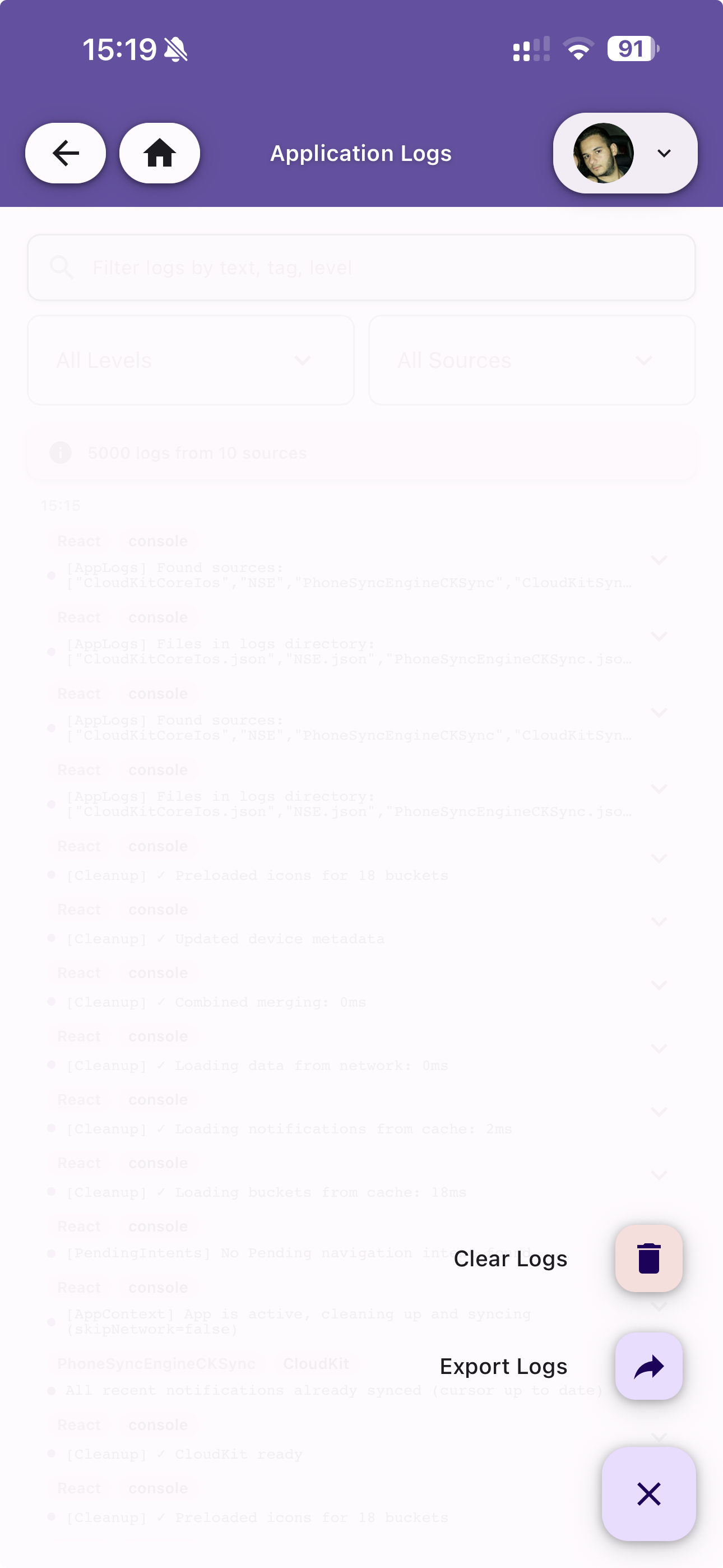 - Source — The module or engine that generated the log (e.g. React, CloudKit, PhoneSyncEngine)