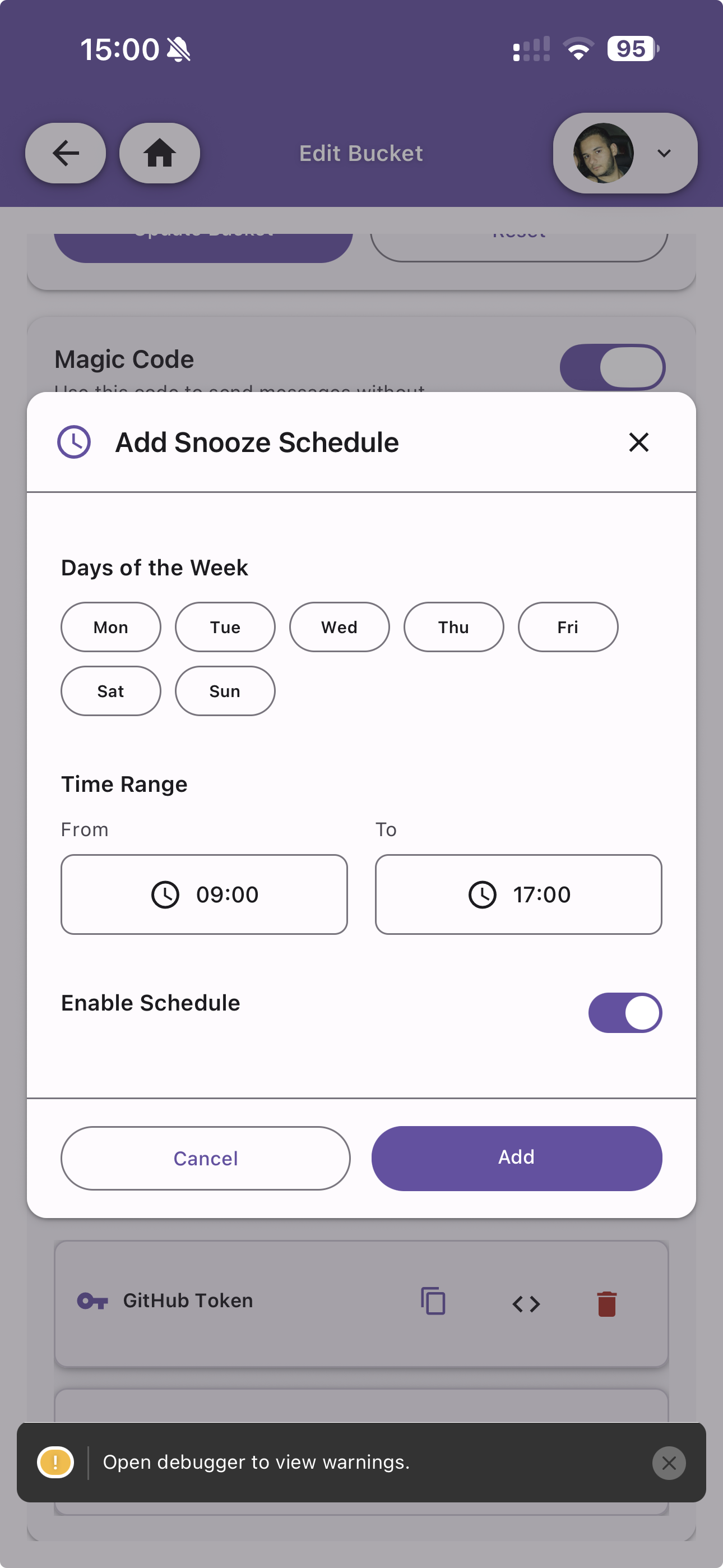 Schedule automatic snooze periods for the bucket. During snoozed times, notifications are silenced.