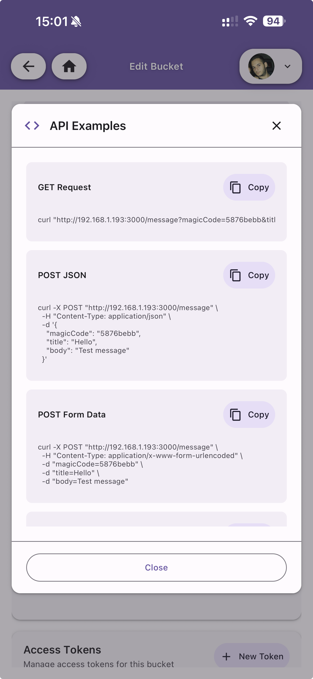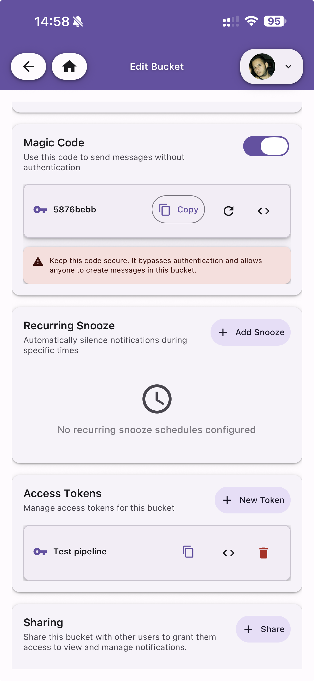 A unique code that allows external systems to send notifications to this bucket without authentication. The magic code is shown and can be copied or regenerated.