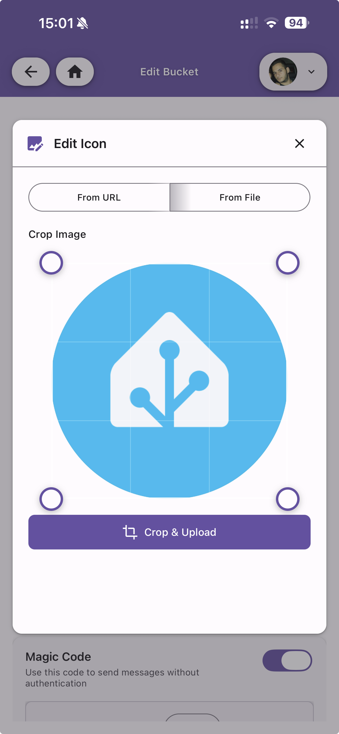 Customize the bucket icon by uploading an image from a URL or file. The editor provides a crop tool to adjust the image before saving.