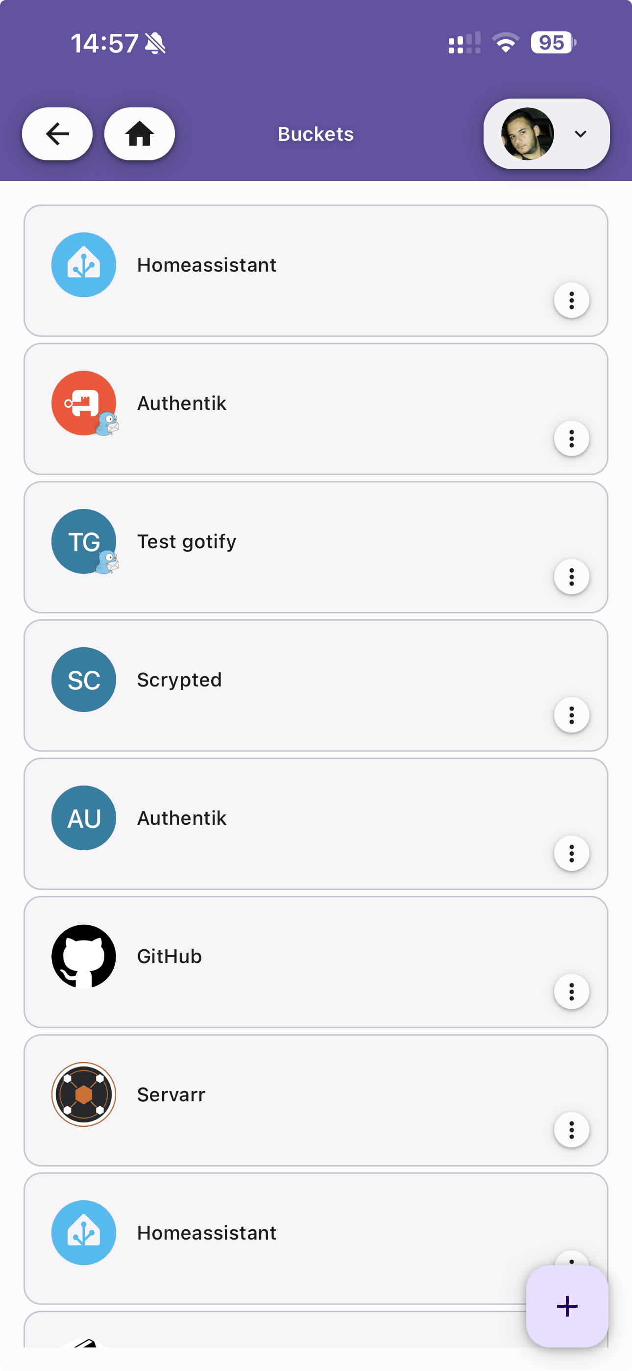 View all your buckets in a scrollable list. Each bucket displays its icon (with color and initials), name, and a menu for quick actions. Tap a bucket to open its edit screen.