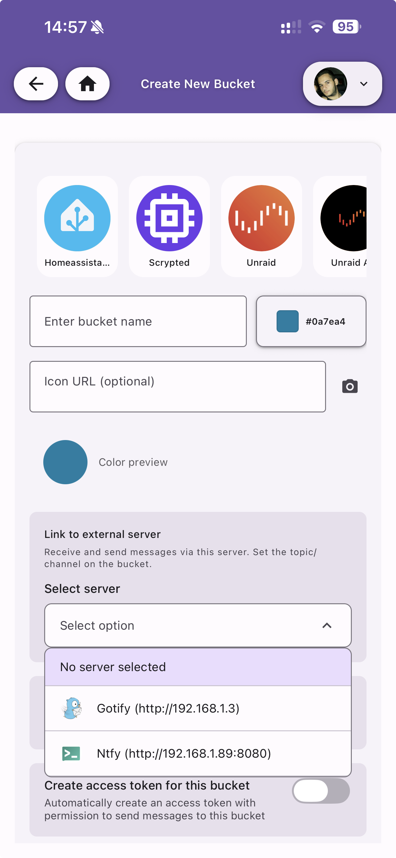 | External Server | Optionally link the bucket to an external notification server (Ntfy, Gotify). Only available for self-hosted instances |