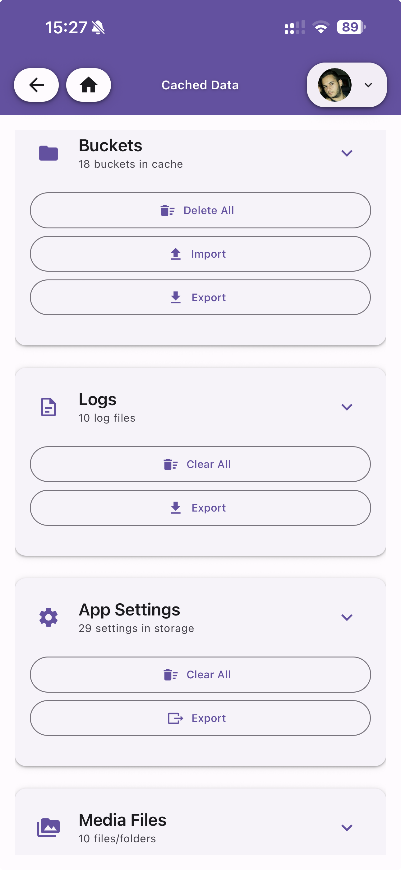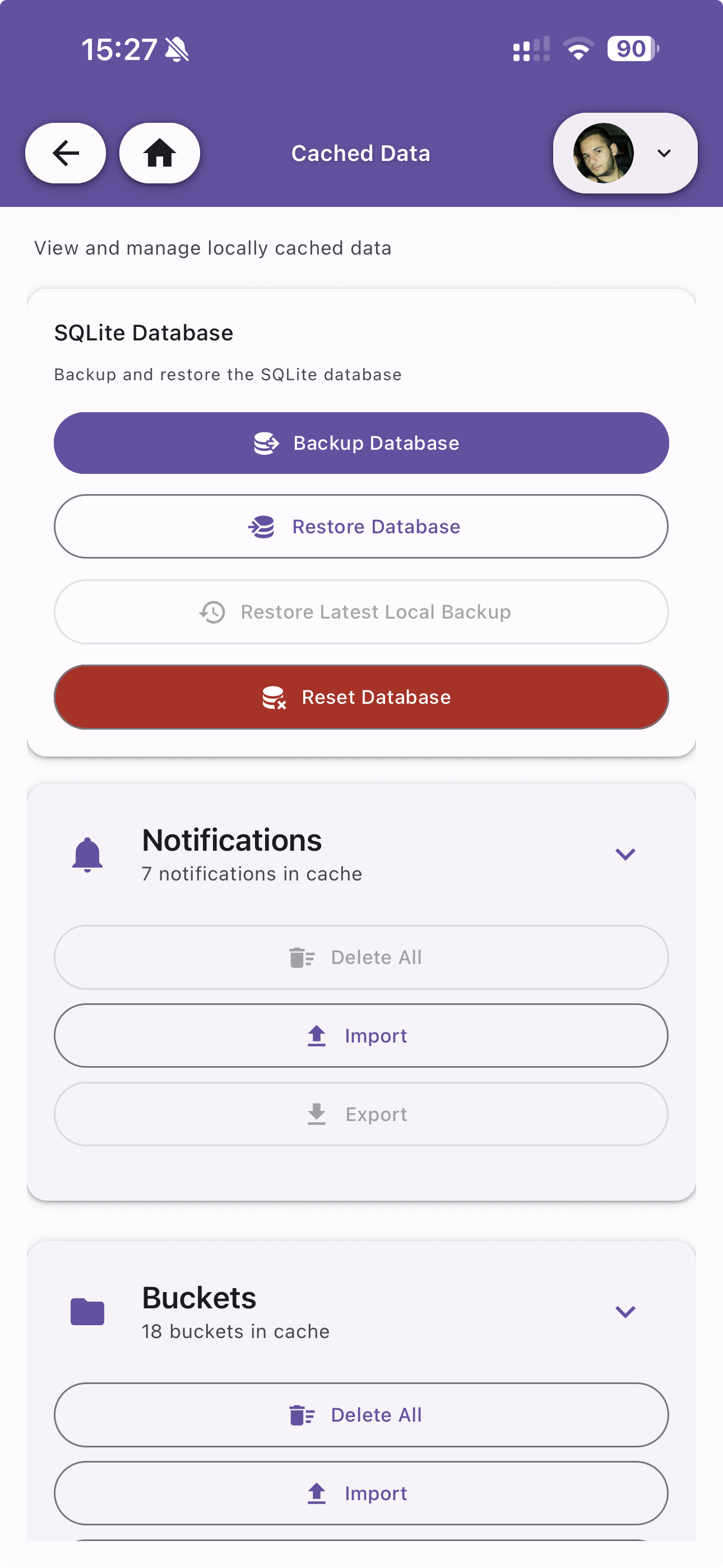 View and manage all locally cached data on the device. Zentik stores notifications, buckets, logs, settings, and media files locally for offline access and performance.