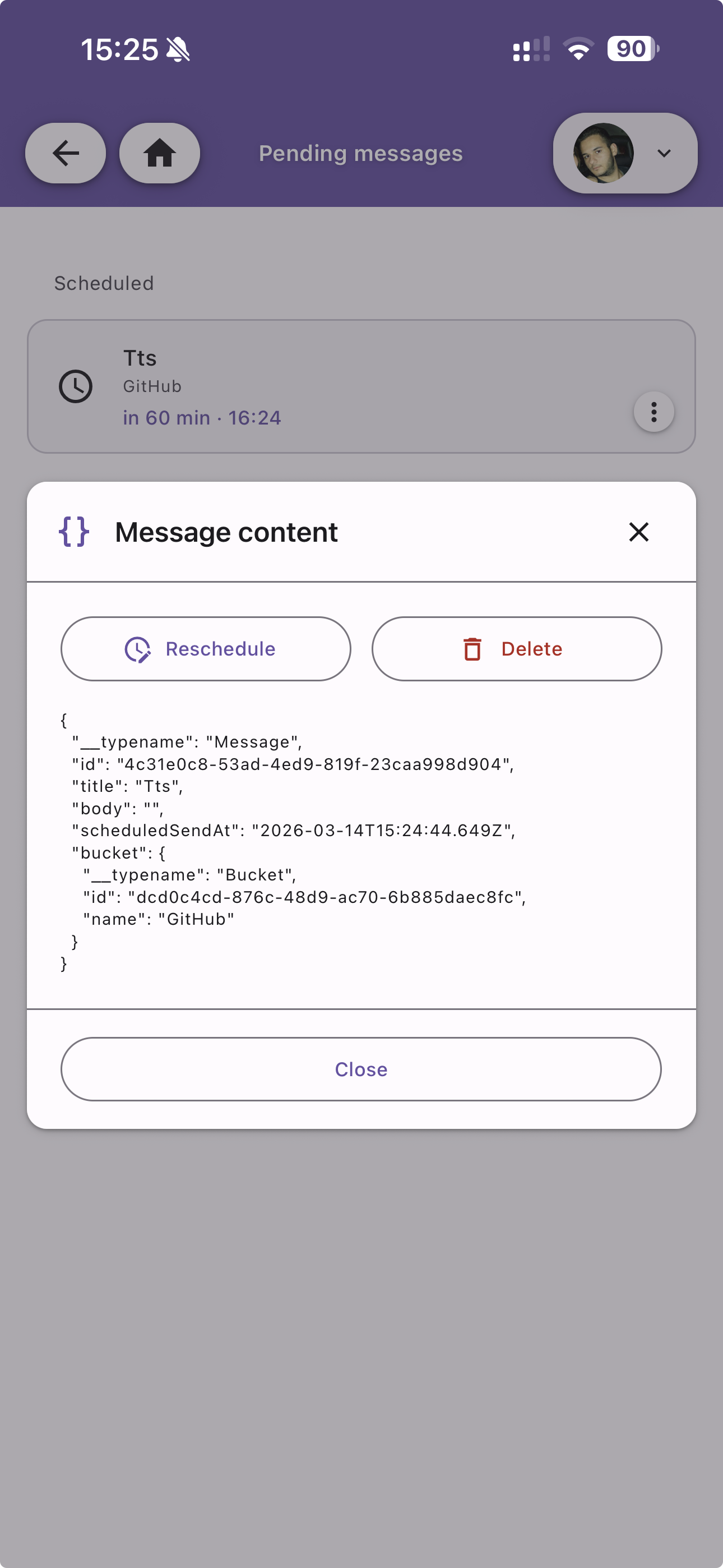 Tap a pending message to view its full content as JSON, including the message ID, title, body, scheduled date, and destination bucket.