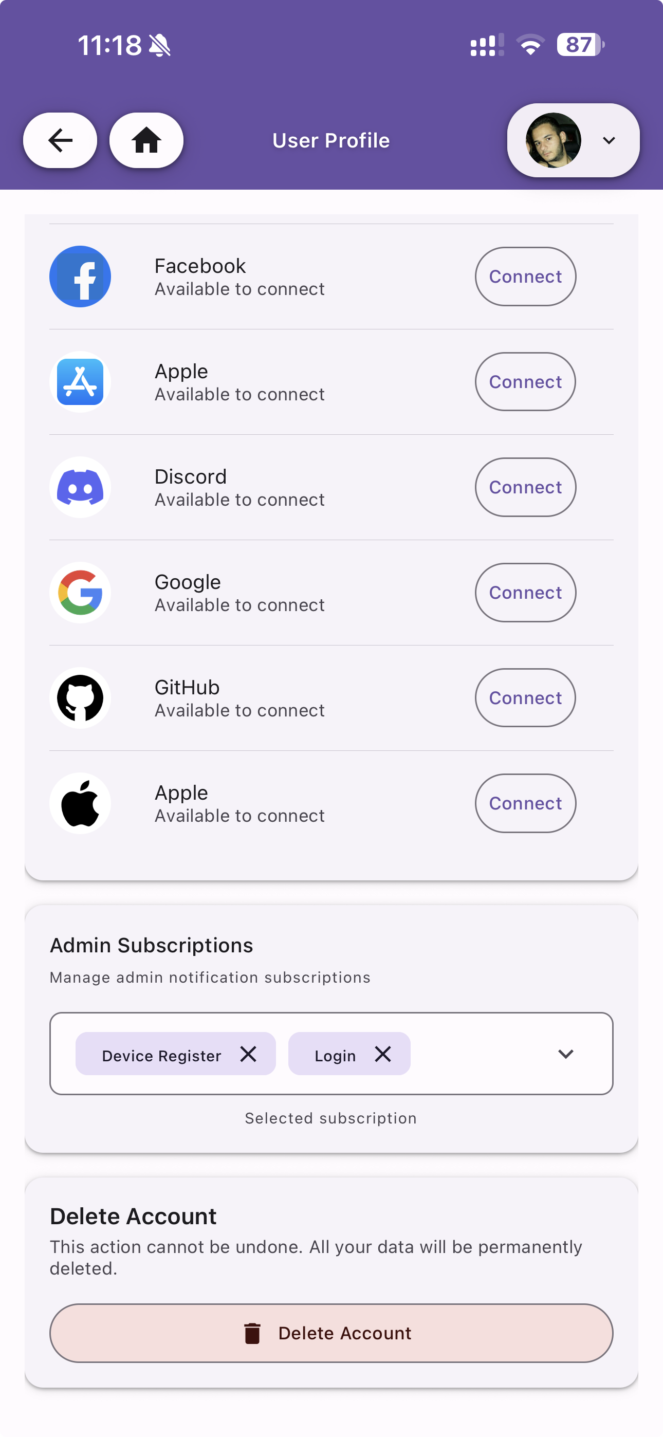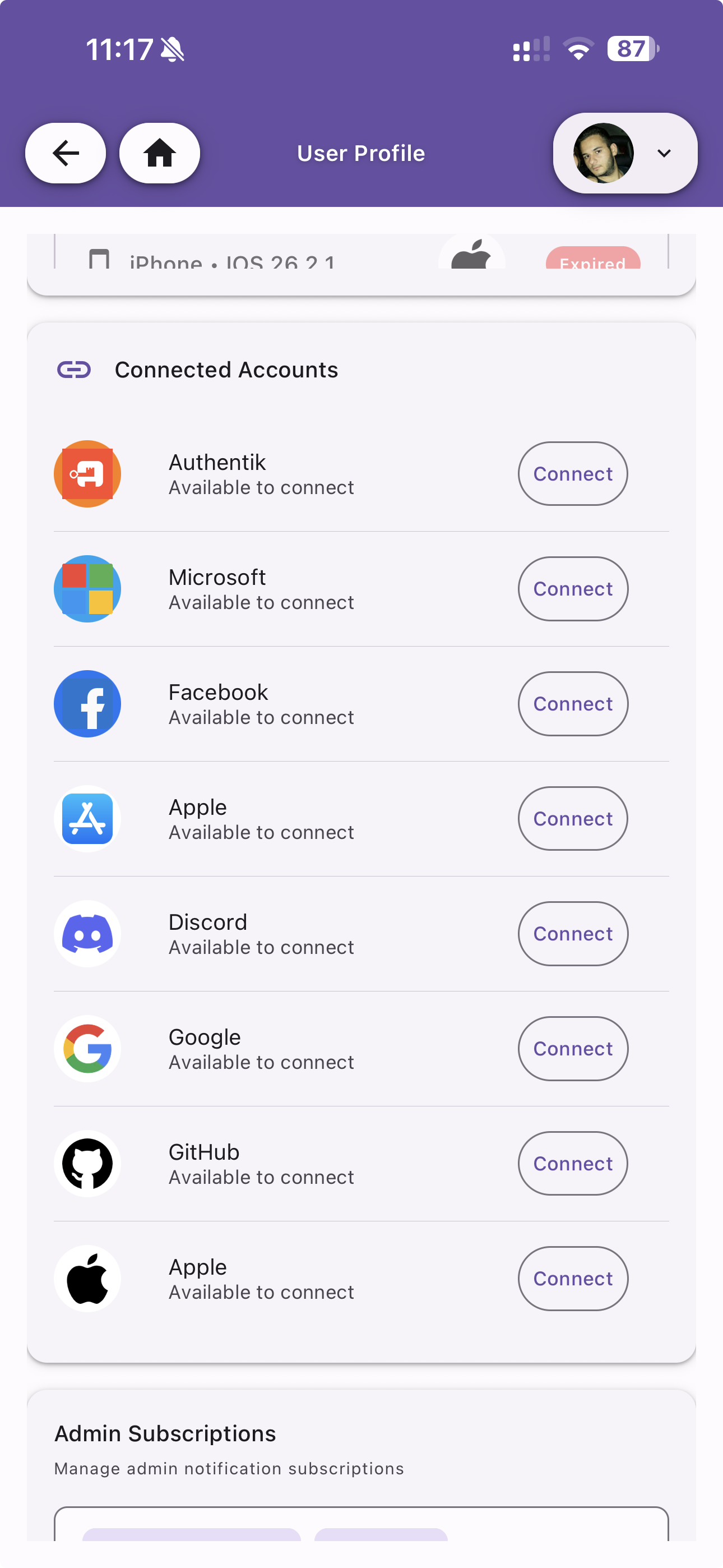 Manage your account details, sessions, connected accounts, and admin subscriptions.