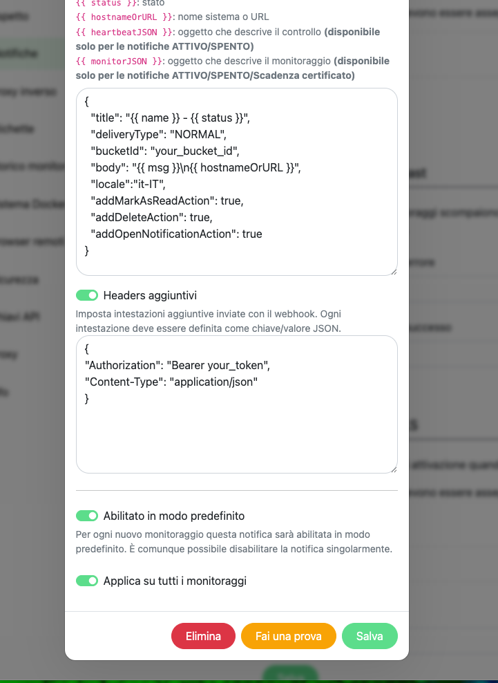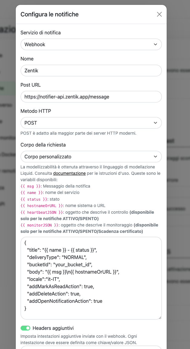 your_bucket_idwith your actual Zentik bucket ID. You can use any attribute from the Message documentation. - Additional Headers: Enable this option and configure: