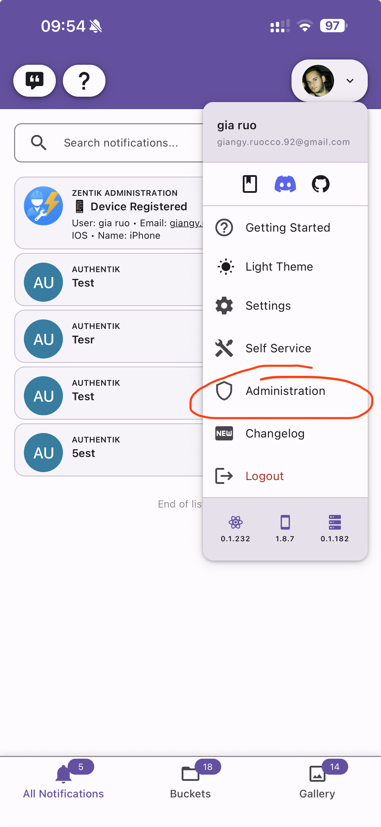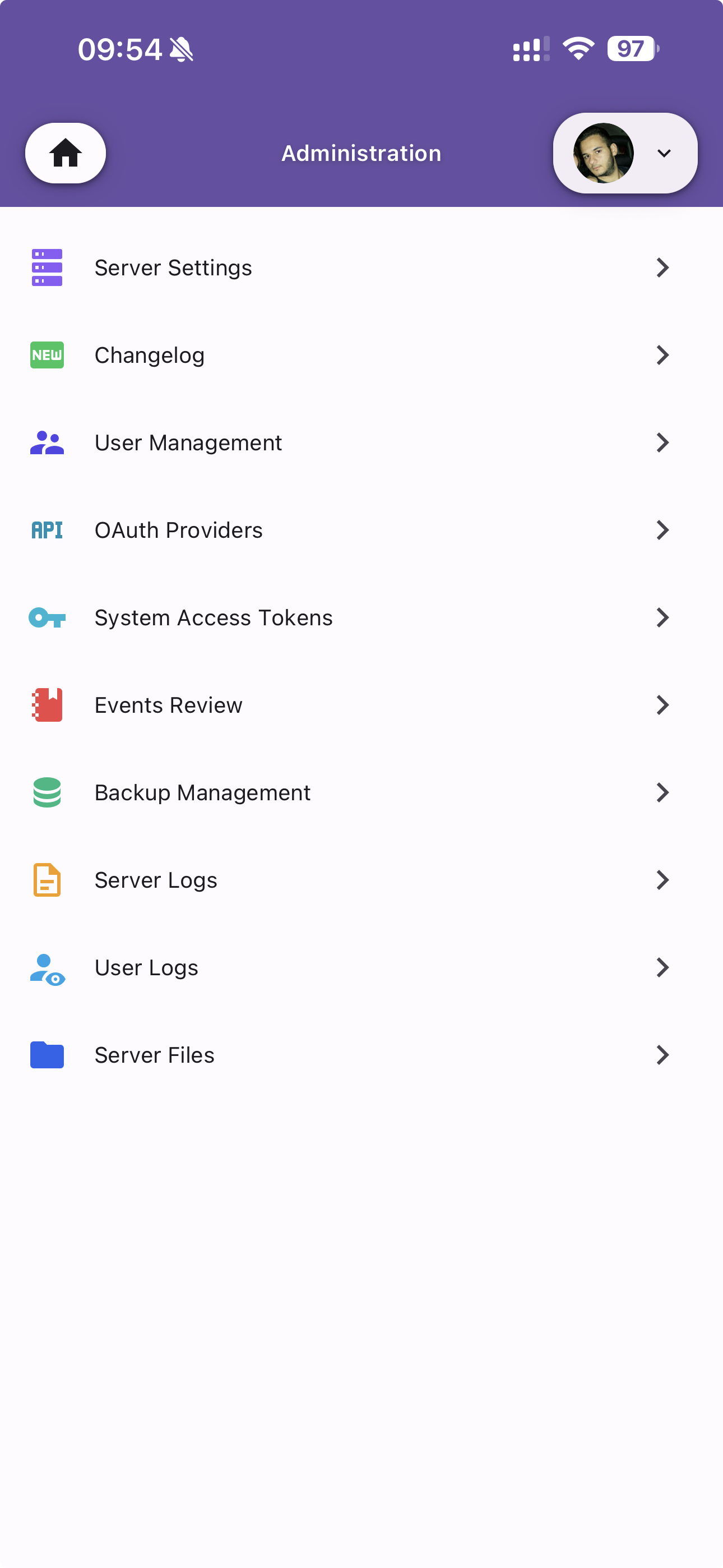 To access the administration panel, tap your avatar in the top-right corner and select Administration. This section is only available to users with the ADMIN role.